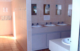 toilet block including hand basins, flush toilets, showers, razor